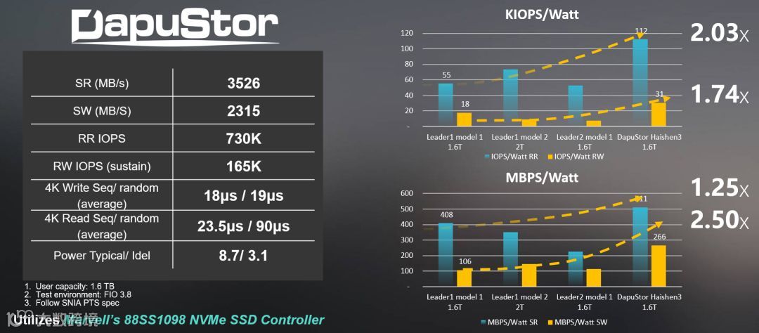 同时,在客户端,Marvell创新SSD技术也助力合作伙伴推出了新一代SSD产品,帮助PC、笔记本、超极本等实现了更高的性能,极大的改善了下一代计算设备的用户体验。如与DapuStor合作推出的高性能NVMe SSD, 就是采用了Marvell 88SS1098 NVMe SSD 系列主控,拥有强大吞吐量性能及优异的产品性能。