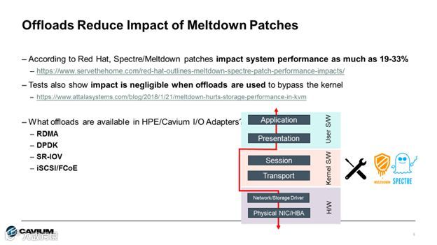 存储卸载和SR-IOV、RDMA 及DPDK 等智能卸载都将绕过O/S内核,因此可以避免Spectre和Meltdown补丁带来的性能影响。这意味着使用智能I/O适配器的智能卸载功能不会受到补丁的影响,从而提高I/O性能。