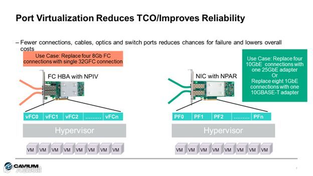 Cavium光纤通道HBA 部署了N-port ID Virtualization(NPIV),因此在系统管理程序中可以将一个光纤通道端口虚拟为多台光纤通道适配器进行使用。