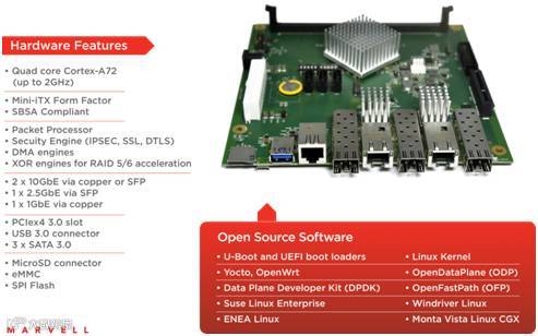 Marvell去年发布的MACCHIATObin开发板基于ARM64平台,集成了虚拟化、高速网络和安全加速引擎等技术,并且完全支持开源软件。