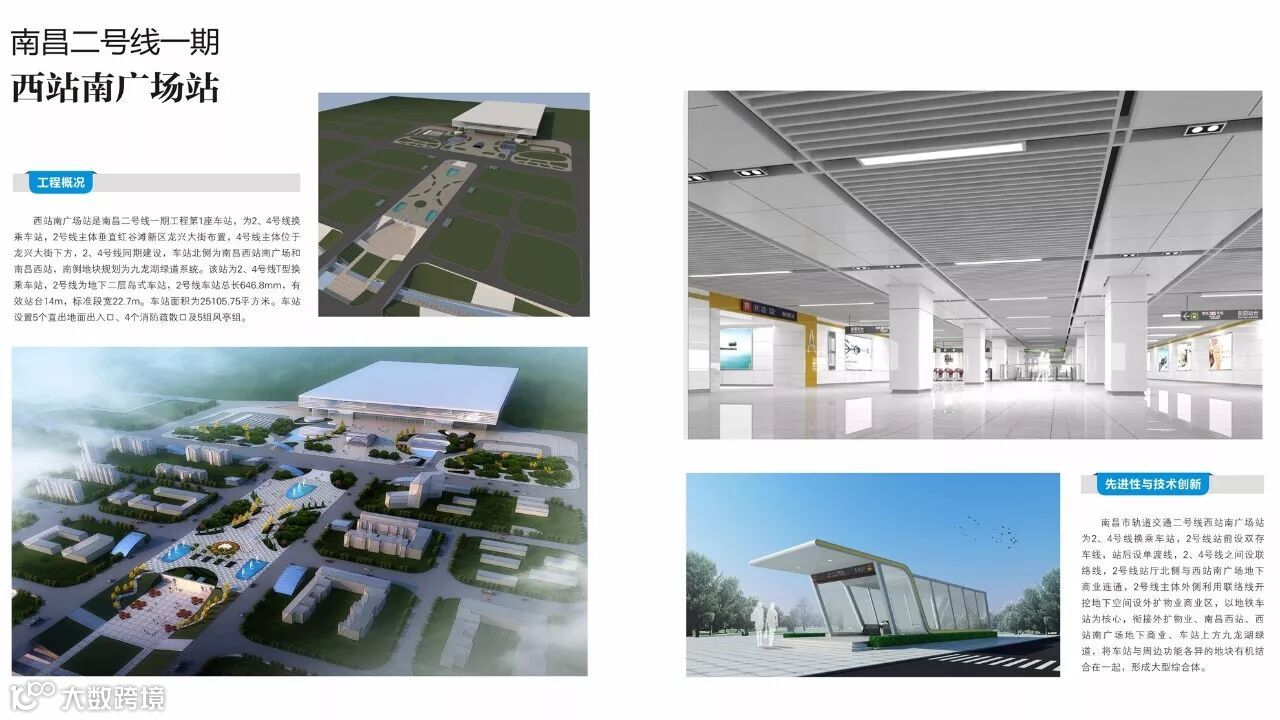 西站南广场站是南昌二号线一期工程第1座车站,为2、4号线换乘车站,2号线主体垂直红谷滩新区龙兴大街布置,4号线主体位于龙兴大街下方,2、4号线同期建设,车站北侧为南昌西站南广场和南昌西站,南侧地块规划为九龙湖绿道系统。该站为2、4号线T型换乘车站,2号线为地下二层岛式车站,2号线车站总长646.8mm,有效站台14m,标准段宽22.7m。车站面积为25105.75平方米。车站设置5个直出地面出入口、4个消防疏散口及5组风亭组。