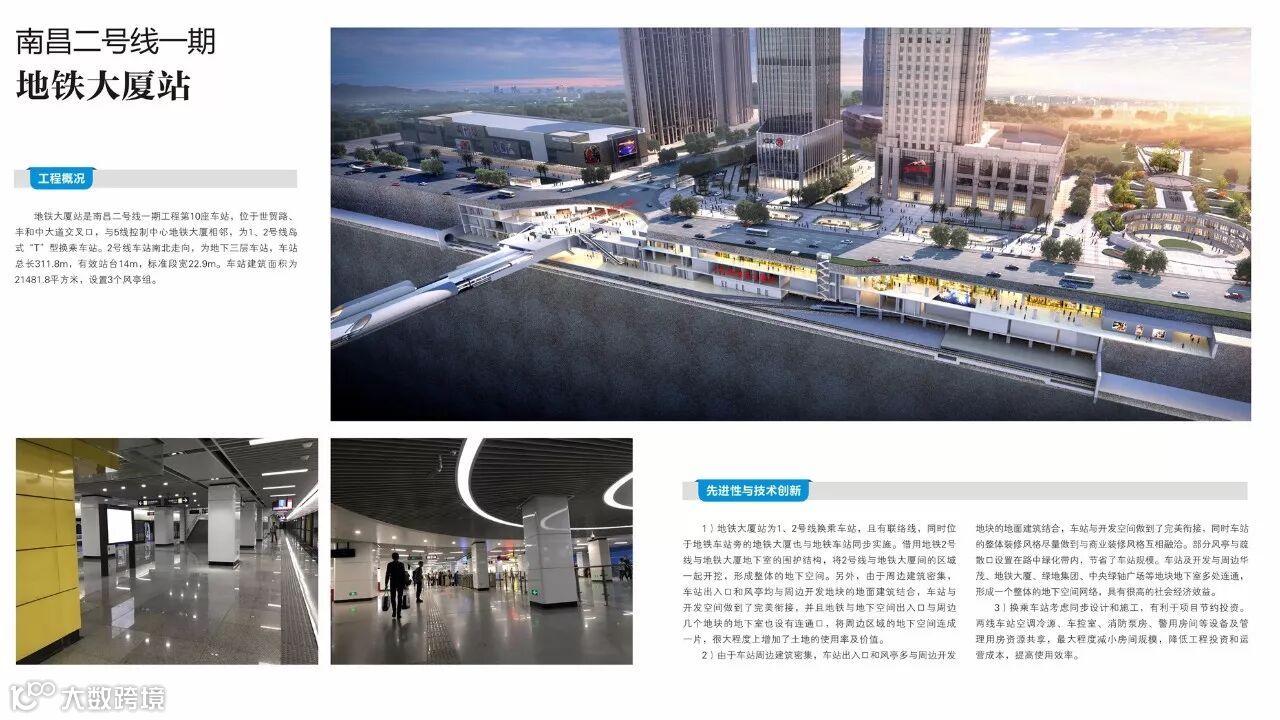 地铁大厦站是南昌二号线一期工程第10座车站,位于世贸路、丰和中大道交叉口,与5线控制中心地铁大厦相邻,为1、2号线岛式“T”型换乘车站。2号线车站南北走向,为地下三层车站,车站总长311.8m,有效站台14m,标准段宽22.9m。车站建筑面积为21481.8平方米,设置3个风亭组。