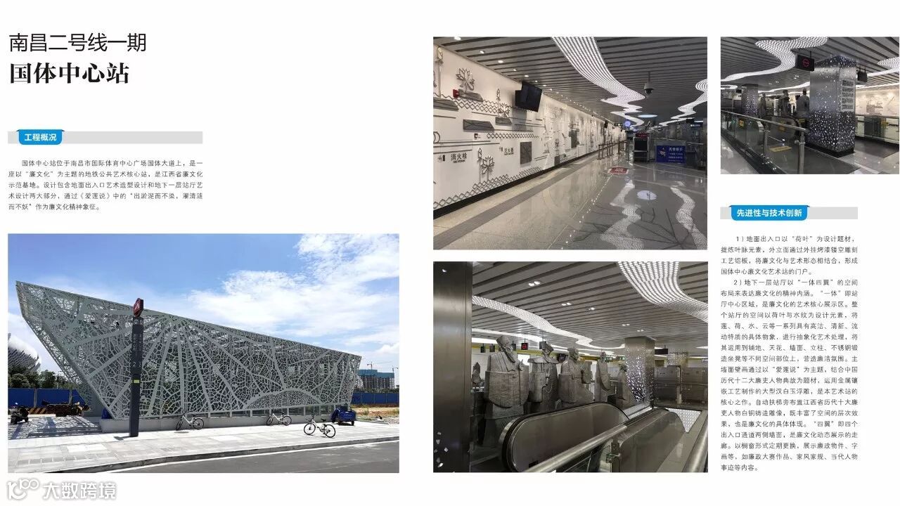 国体中心站位于南昌市国际体育中心广场国体大道上,是一座以“廉文化”为主题的地铁公共艺术核心站,是江西省廉文化示范基地。设计包含地面出入口艺术造型设计和地下一层站厅艺术设计两大部分,通过《爱莲说》中的“出淤泥而不染,濯清涟而不妖”作为廉文化精神象征。