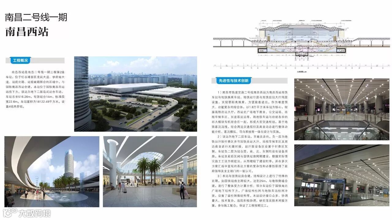 1)南昌市轨道交通二号线南昌西站为南昌西站高铁车站与地铁换乘车站,地铁站厅层与高铁出站大厅同层设置,实现零距离换乘,方便旅客进出。作为难度很大、功能复杂的综合体,以1.8万平方米车站为核心,衔接高铁出站大厅,西站北广场地下商业、公交站场、出租车候车区、长途客运站等,将地铁车站与功能各异的四大模块有机结合在一起,形成大型交通枢纽。基于地铁客流流线,结合周边交通组织及商业动态进行整体功能分析、客流模拟、导向系统等一体化设计与实施。