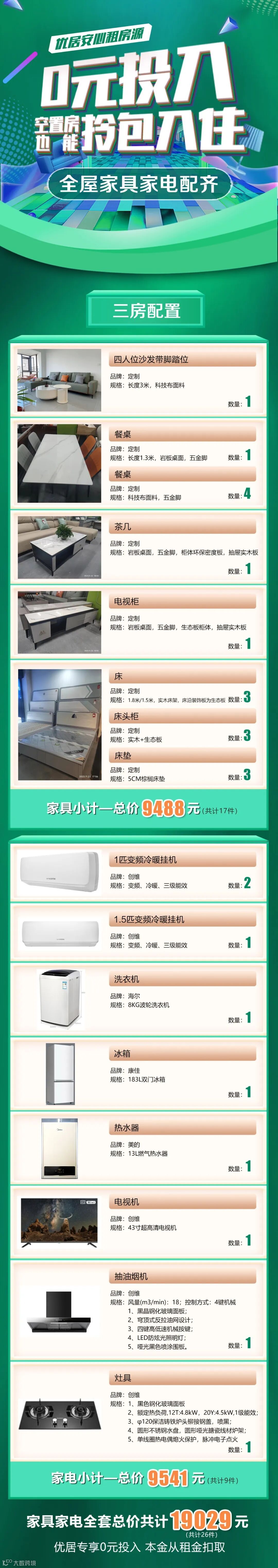以三房为例,全屋品牌家具家电配齐,总价仅1.9万,到手26件套,轻松实现拎包入住 ↓↓↓