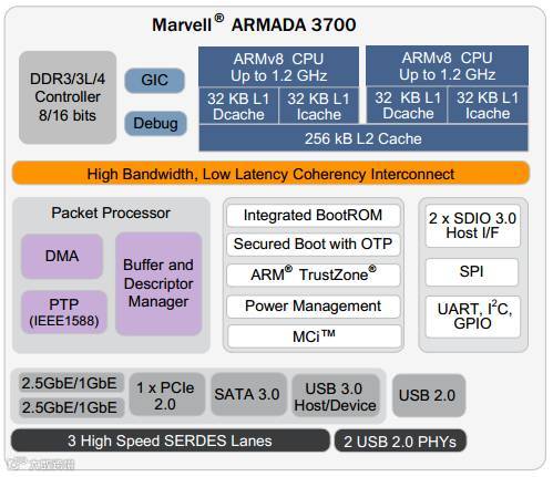 可用于Marvell ARMADA 38x系列的ARMADA SoC系列嵌入式处理器的主要特性: