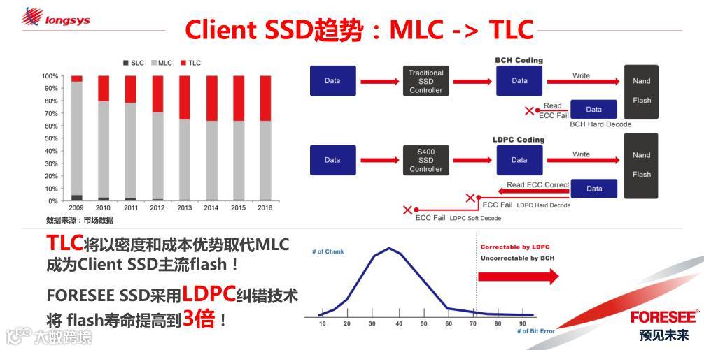 第五:TLC将以密度和成本优势取代MLC成为SSD主流flash,而利用Marvell成熟的LDPC纠错技术,将使FORESEE得flash寿命提升3倍;