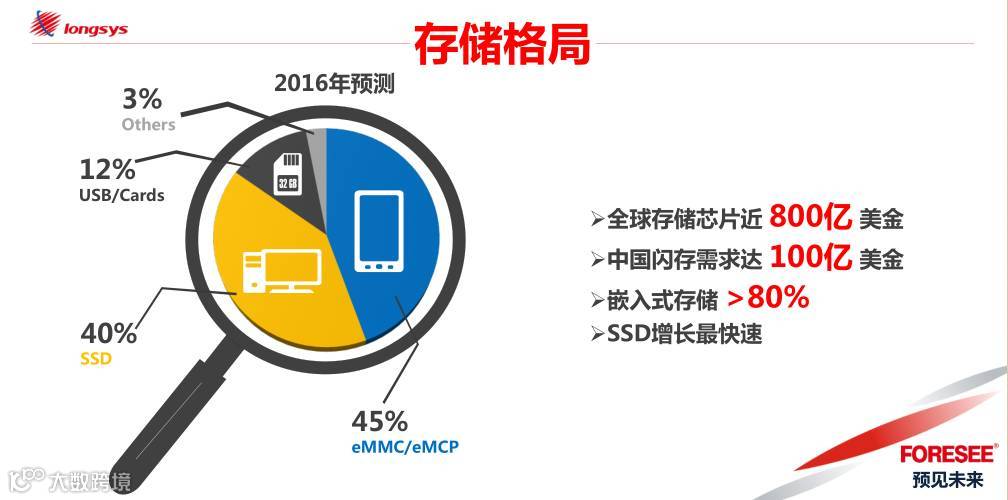 在江波龙(longsys)电子有限公司董事长蔡华波先生现场分享的ppt中,他谈到了一组数据:全球存储已近800亿美金、中国闪存需求长达100亿美金,嵌入式存储的市场份额高达80%以上,而其中SSD增长最为快速。