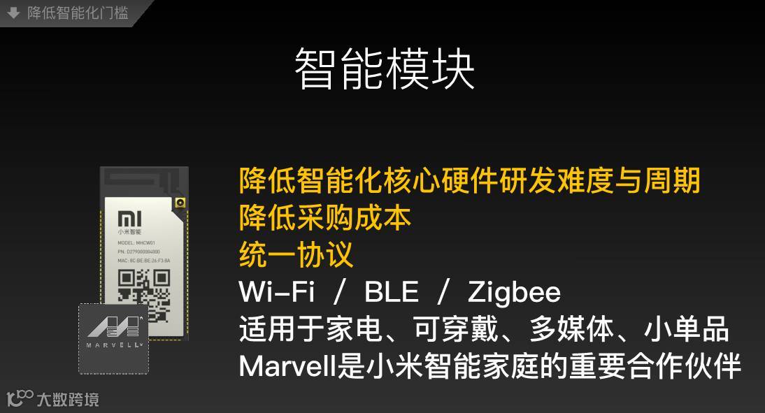 小米科技的黄江吉也在致辞演讲中指出:“小米科技非常看好IoT和智能家居领域,我们认为这个领域有可能会比移动互联网大5到10倍。经过一年多的发展,我们坚定地相信用户对智能产品的需求真实存在,而不是业界一厢情愿,其中一个原因就是我们解决了一些核心问题,即通过与Marvell合作,推出了可降低智能化核心硬件研发难度与周期、降低采购成本并且采用统一协议的智能模块,适用于家电、可穿戴、多媒体、小单品等各类智能产品,推动它们进入千家万户,而一年多下来这个智能模块表现非常好,本身就已成为一个爆品,恭喜Marvell!”