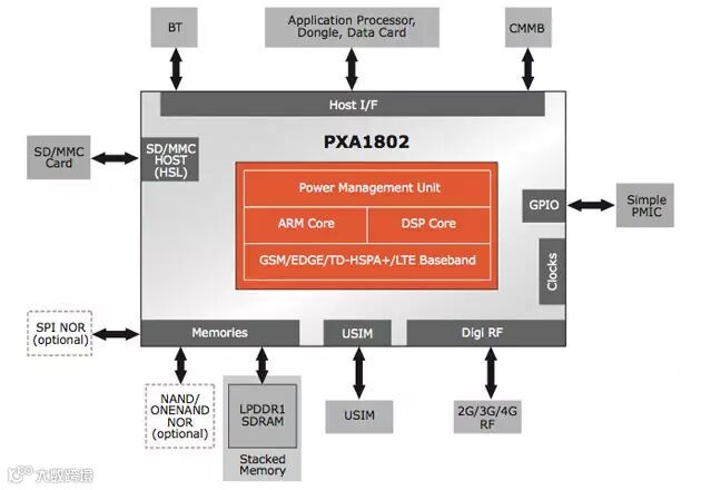 PXA1802将Marvell的业界领先的芯片与蜂窝调制解调器技术完美地整合在了一起,可实现高性能、低功耗的智能手机以及平板设备的设计,同时可以在TDD-LTE(时分双工长期演进)、FDD-LTE(频分双工长期演进)、TD-SCDMA(时分同步码分多址接入)和EGPRS(增强型GPRS)配置中使用和支持该设计。