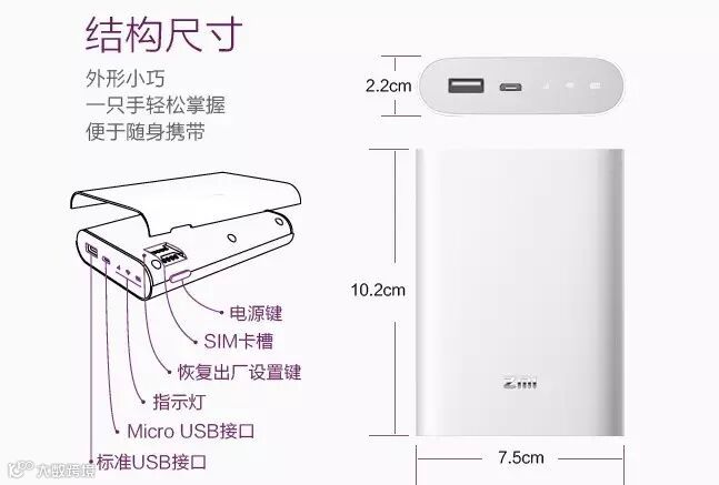 ZMI-MF855的三围尺寸分别是22x102x75mm,重量仅220g,卡槽为micro SIM。外观看它跟小米自己的移动电源很是相似,容量为7800mAh,提供了单USB输出接口以及网络信号、Wi-Fi信号和剩余电量指示灯。