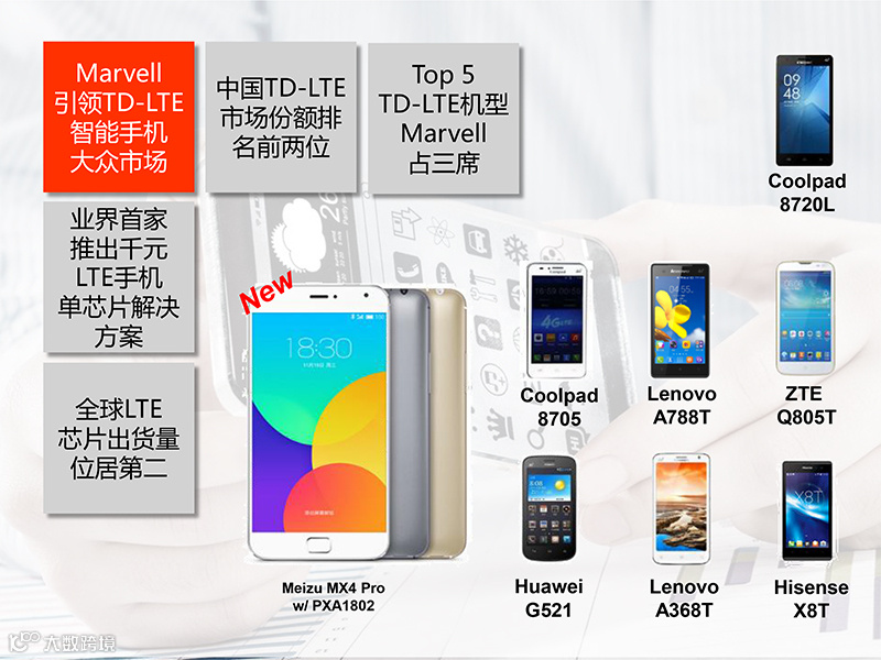 纵观Marvell近年来在LTE市场的表现,可以称得上处于领头羊的位置。全球第一款4G LTE千元机酷派8720L就采用了Marvell的方案,另一款销量非常好的Lenovo的A788T同样采用了Marvell的芯片解决方案。而于近日重磅亮相的魅族最新旗舰智能手机MX4 Pro中采用的Marvell 五模4G LTE调制解调器PXA1802是业界第一个通过CTA(入网许可)测试的芯片。除手机外,基于Marvell LTE芯片解决方案开发的平板电脑产品在市场上也广受欢迎,其中包括三星GALAXY Tab3、Verizon 8寸 LTE版等。