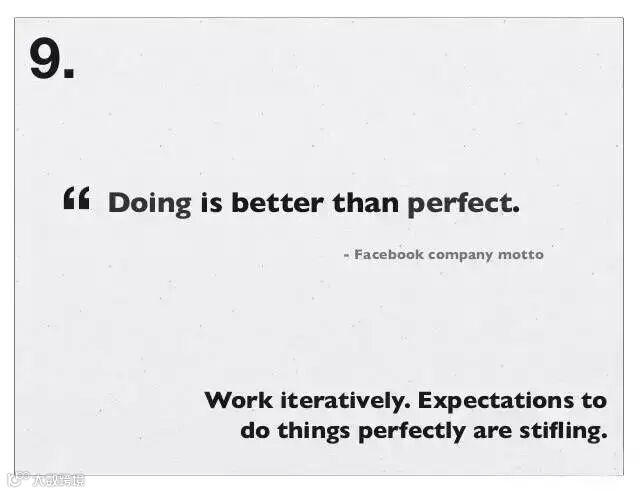9、迭代工作,期待完美收工会令人窒息:“做完事情,要胜于完美收工” Facebook 办公室墙壁上贴的箴言。动手做,胜过任何完美的想象。
