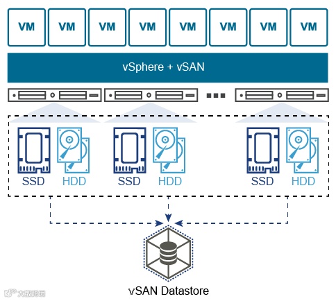 VMware vSAN,全名VMware Virtual SAN,又称vSAN。我们可以把vSAN理解为vSphere Storage,是vSphere虚拟机后端的企业级高性能存储。vSAN其实就是基于服务器端存储的共享分布式对象存储系统,可以用来取代vSphere后端的外置磁盘阵列。