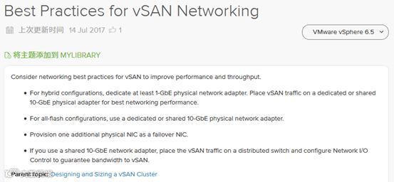 最佳实践是为了获得最好的性能,因此10G 共享网卡作为最低配置更匹配系统的实际要求,单独的10G网卡或者更高速率的接口,才能实现更好的性能特别是全闪存配置的要求。在vSAN最新版本所对应的vSphere 6.5系统配置当中,明确了以下网卡都可以支持: