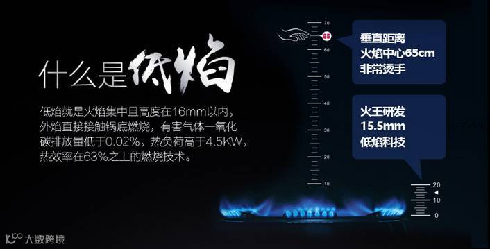 而低焰灶火焰高度在16mm以内,除此之外,还要同时满足有害气体一氧化碳排放量低于0.02%,热负荷高于4.5KW,热效率在63%之上。火王作为低焰灶就是的代表,火焰高度15.5mm,热效率高达66%。