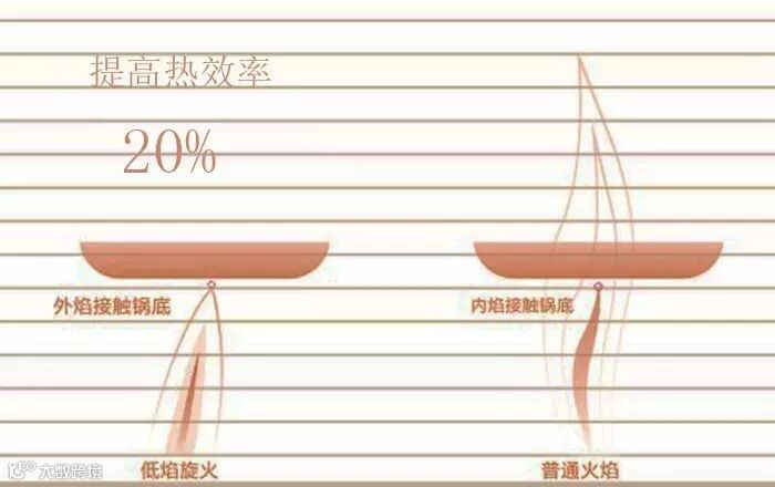 从火力的角度看,火王低焰灶外焰完全贴合锅底,产生的热量完全被锅吸收,火力更大。