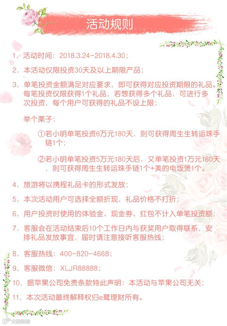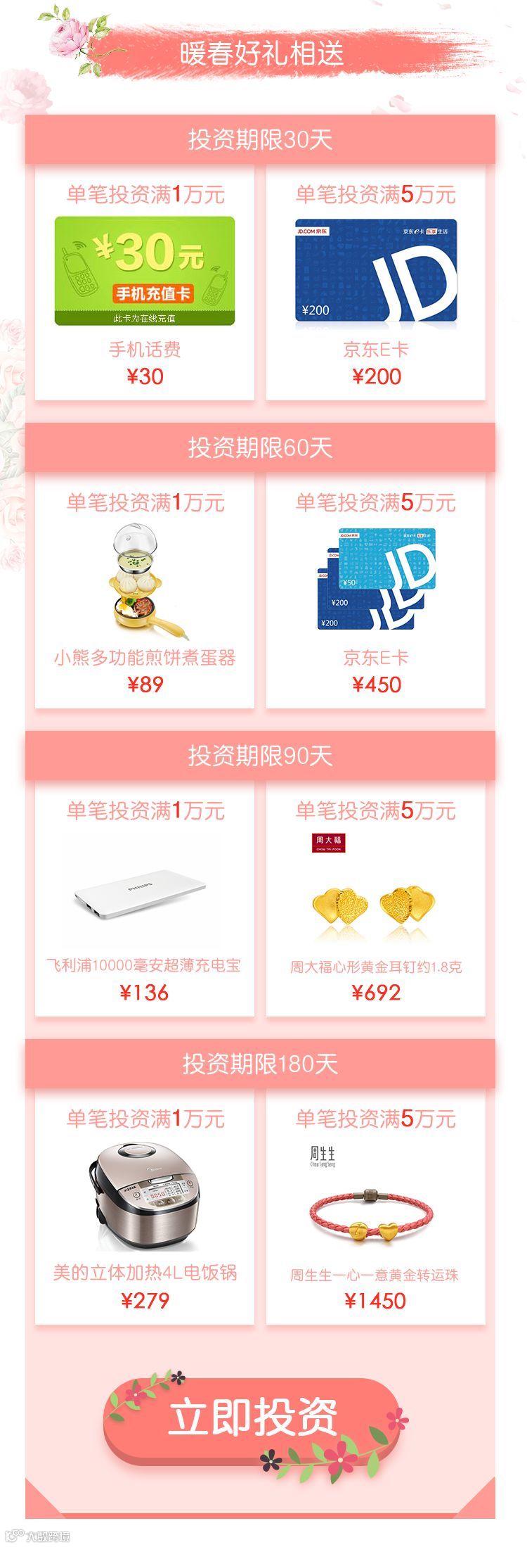 活动期间内,单笔投资达到相应档位即可获得暖春好礼。