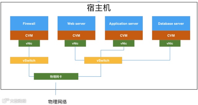 上图描述了传统虚拟化网络的实现,包括了以下元素: