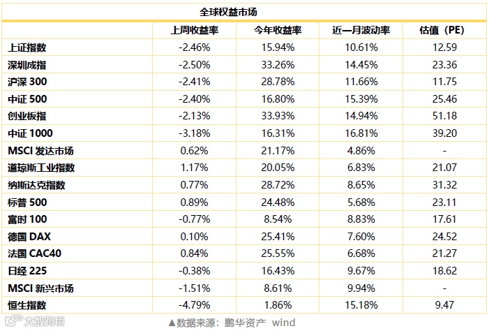 股票市场。上周A股下挫,上证指数下跌近2.5%。除食品饮料等少数行业外,大部分行业指数均下跌,家电、农林牧渔等大消费板块及采掘、有色金属等周期板块跌幅较大。主要宽基指数跌幅相近,沪深300、中证500、创业板指均下跌超过2%。市场情绪较弱,成交量创近三个月新低。陆股通流入力度减弱,两融余额略降。当前A股处在大的区间震荡,呈现出结构分化、风格轮动的特点。