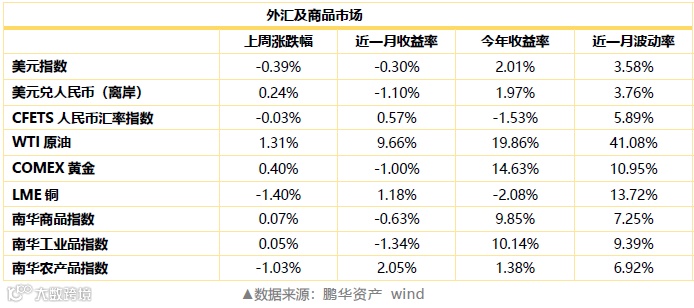 商品市场。上周国际原油震荡走强,黄金小幅反弹,铜等金属下跌。国内市场,农产品小幅回调,工业品表现分化。黑色品种反弹,有色金属小幅反弹,能化品种则继续下跌,贵金属微跌。整体来看,近阶段,工业品仍然表现较弱但已有分化,农产品表现较强,部分品种表现出明显的趋势。