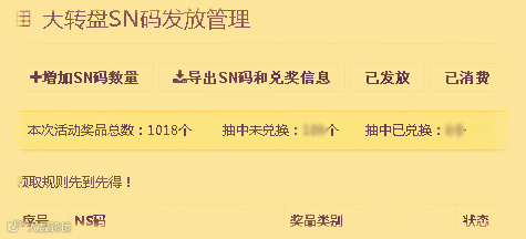 活动大转盘SN码是由奖品数量生效的,粉丝每抽中一次,系统自动发放该奖品SN码,如燃气灶SN: A002120189380821219。