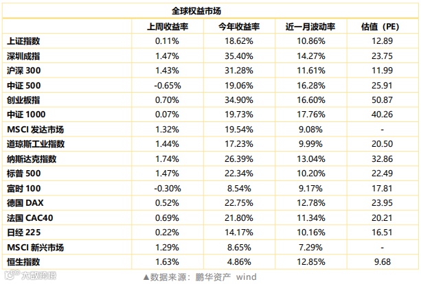 股票市场。上周A股市场震荡分化,上证指数微涨。权重股拉升,沪深300上涨1.43%,家电、食品饮料、医药生物等板块大涨,但中小个股表现较弱,中证500下跌0.64%,钢铁、采掘等周期板块继续疲弱。市场成交量回升,两市日均成交额增至4700亿以上,陆股通资金大幅流入,本周流入超过230亿。本周虽然市场一度走弱,但周五上涨收复周内跌幅,当前A股处在大的区间震荡,呈现出结构分化、风格轮动的特点。