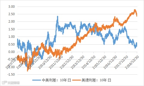 上周中国十年国债收益率下行,美债保持稳定,十年国债中美利差缩至40BP。