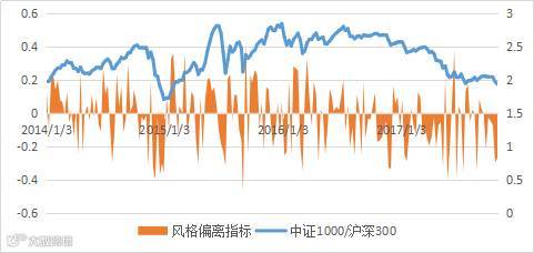 市场风格继续分化,大盘蓝筹表现更优。风格偏离指标持续在0以下。中证1000与沪深300指数比值连续下滑,市场风格呈现价值占优特点。