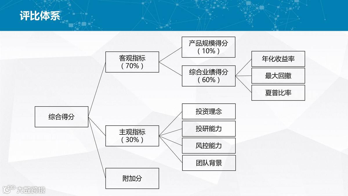 (2)主观指标评选规则(权重30%)主要包括投资理念、投研能力、风控能力、团队背景四大方面,采用专家打分制度。