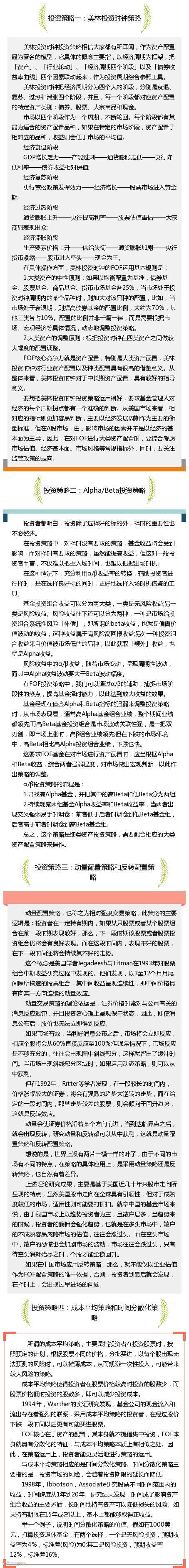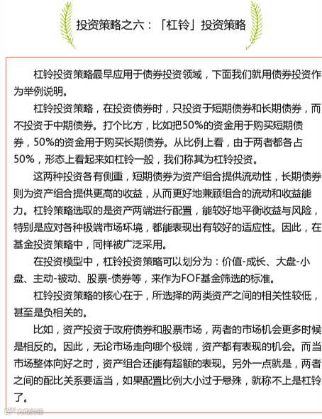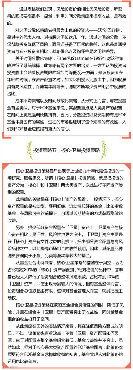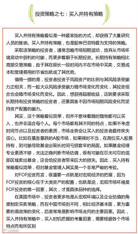 从当前市场上的投资策略种类来看,大致有七种,包括核心*卫星投资策略、「杠铃」投资策略、反向投资策略、成本平均策略和时间分散化策略、买入并持有策略、美林投资时钟策略、Alpha/Beta投资策略。