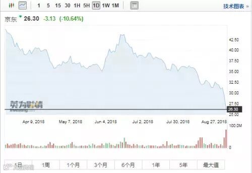 北京时间周四(9月6日)凌晨消息,受多重利空消息影响,京东股价收盘下跌10.64%,报收26.30美元,创2017年1月9日以来收盘新低。
