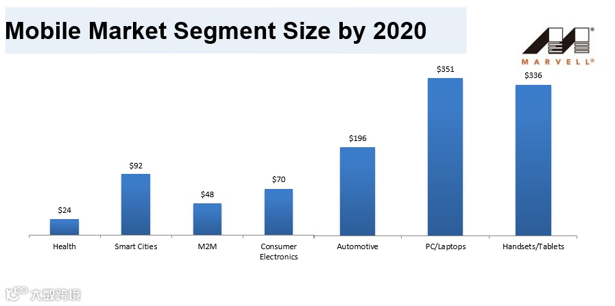 到2020年,移动终端和移动互联网会更加深入到我们生活的各个方面。整个移动市场的容量到2020年,除了我们熟悉的手机、平板和手提电脑这些高容量的终端之外,会有更多、更新的交互方式,与应用方式出现。即使在移动教育、移动健康市场方面,到那时也会有超过240亿美金的规模。同时像智慧城市、智能大楼,甚至智能家庭,这些市场的规模到时也分别会到480亿和980亿。另外更大的一个市场是车联网,到2025年,预测这个市场容量将会超过我们现在所认知的智能手机和智能平板容量的一半以上,也就是1900多亿。