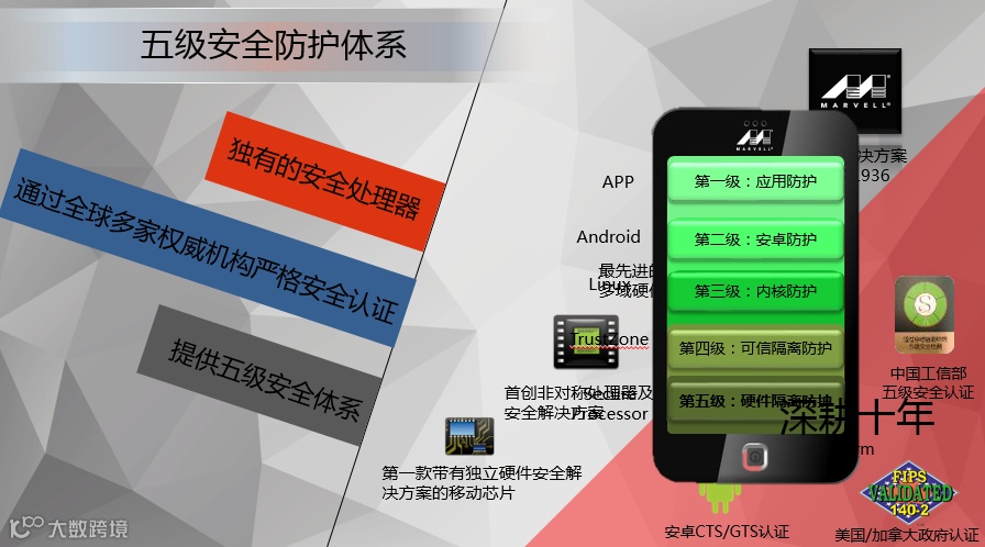 另外一个现在受到极大关注的方面就是安全,无论是用户还是企业的安全。Marvell在这方面已经有十几年的深厚底蕴,我们第一款给黑莓制造的安全手机,就有多个层次的安全性:它具有独立的硬件方式,使得数据保密性和防盗性非常之强,我们的解决方案也得到了很多国际机构的认证。无论是中国工信部,还是国际TEE的认证,更有Android官方的认证,可以保证我们从硬件架构,到硬件上层的软件架构,都真正达到全面安全的需求。