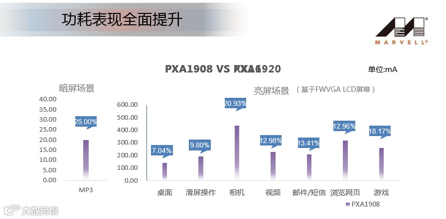 在多核的应用处理器里,最大的挑战就是功耗。现在有些手机跑得太快,或应用跑得太多,后盖就会发热。我们通过检测两代产品,1908和1920,在同样的温度下,通过集成一些新的智能技术之后,1908比1920在不同场景下,都会有很大程度的功耗降低。尽管它的处理能力一直在提高,但他的功耗却在降低。