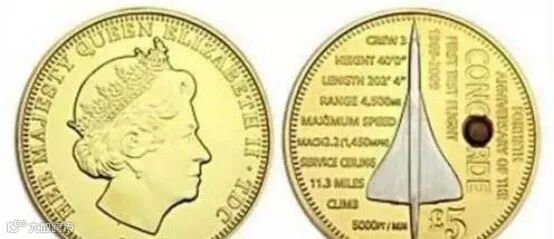 特里斯坦-达库尼亚群岛带有小块协和飞机钛合金的硬币。这枚硬币是为了纪念协和式飞机首航40周年,在2009年铸造的。硬币表层镀金,每面都含有一小块从协和飞机上取下的钛合金,将所有硬币收集起来,你就可以建造一架迷你型和协式飞机了。