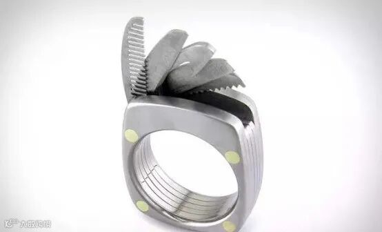 工具戒指采用钛合金材质制作,你可以将之看做戒指中的瑞士军刀——戒指的顶端隐藏了四个小工具在里面,分别是开瓶器、小刀、锯子,和一把小梳子。