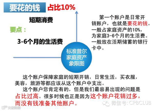 第一个账户是日常开销账户,也就是要花的钱,一般占家庭资产的10%,为家庭3-6个月的生活费。