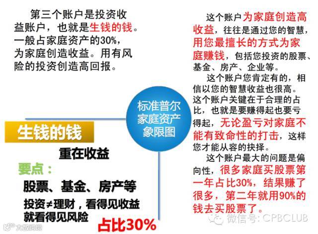 第三个账户是投资收益账户,也就是生钱的钱。一般占家庭资产的30%,为家庭创造收益。
