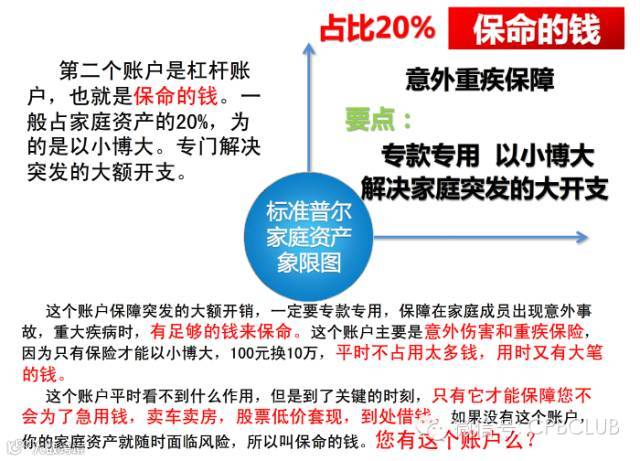 第二个账户是杠杆账户,也就是保命的钱,一般占家庭资产的20%,为的是以小博大。专门解决突发的大额开支。
