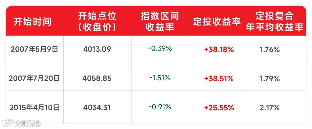 如果我们分别在2007年5月、2007年7月、2015年4月开始定投(由于最近一次收站4000点是今年10月,时间间隔太短,不含在本次统计中),截至2025年11月7日(沪指收盘3997.56点):