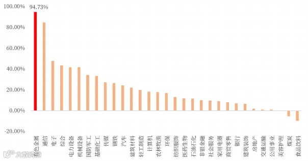 2025年,有色金属以全年94.73%的涨幅,超越通信、电子等AI加持行业,领涨31个申万一级行业。