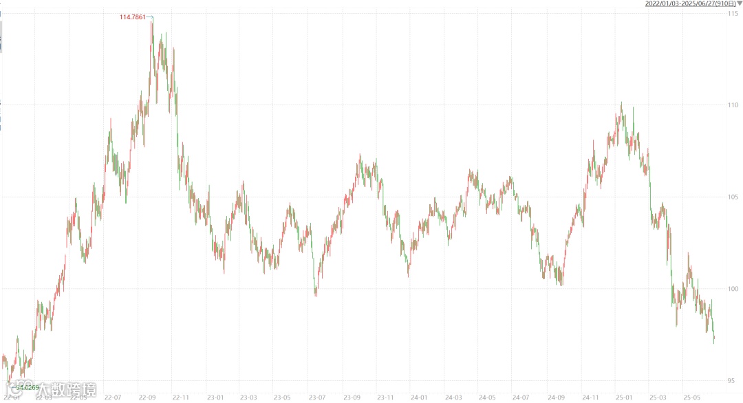 6月26日,美元指数跌破97,从今年年初高点110算起,跌幅超过11%。