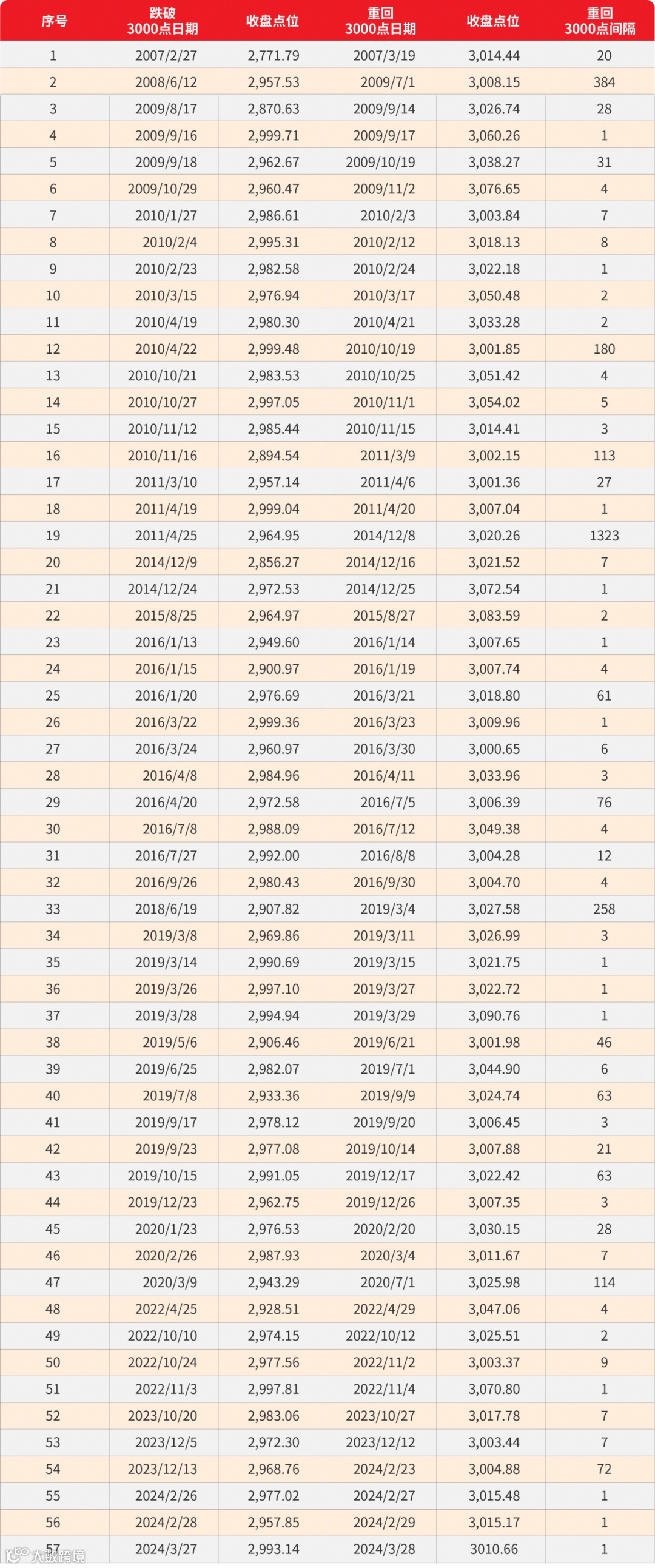 回顾沪指之前57次收复3000点,平均用时53天,中位数用时5天,有37次在10天就回到了3000点。