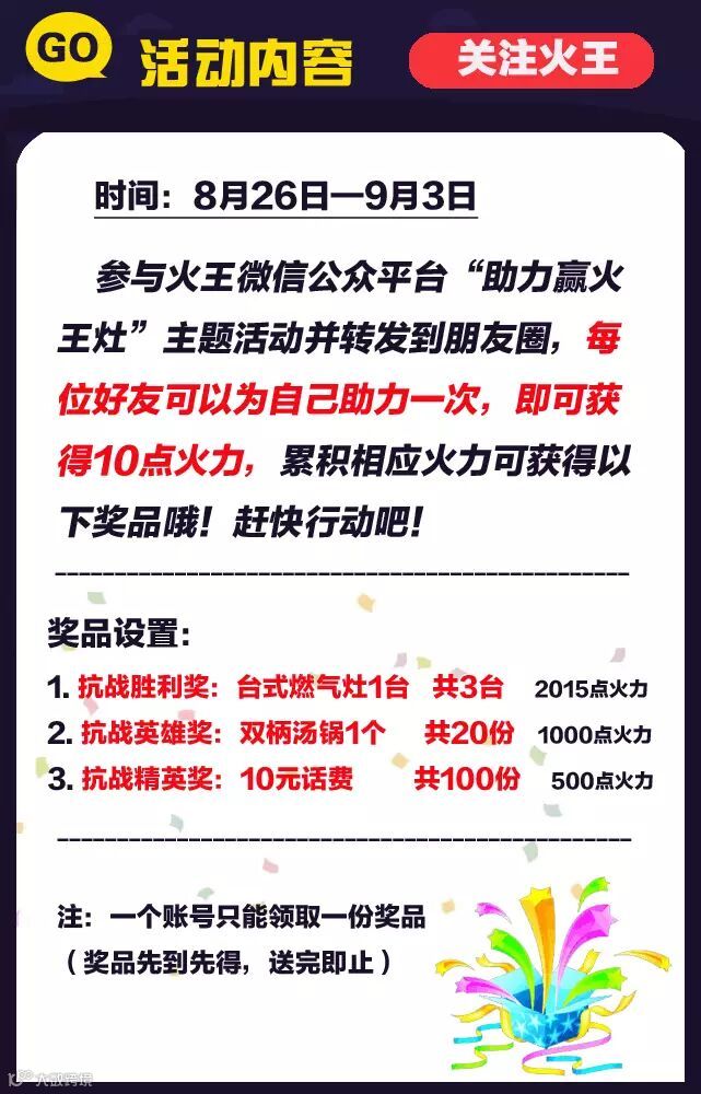 导读:活动内容 转发火王微信公众平台“纪念战胜70周年,火王为中国抗战胜利喝彩! ”主题活动信息 到朋