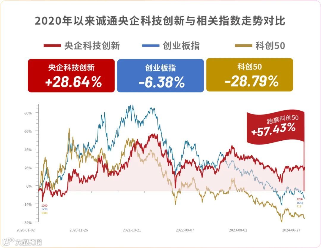 Wind数据显示,截至今年6月30日,中证诚通央企科技创新指数自基日(2019/12/31)以来上涨28.64%,大幅优于科创50(-28.79%)、创业板指(-6.28%)等科创类指数同期表现。
