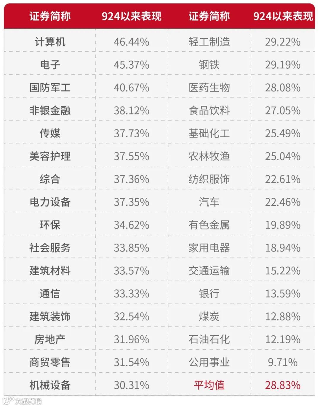 Wind数据显示,924以来(2024/09/24-2024/10/28),31个申万一级行业指数全线上涨,其中有77%的行业涨幅超过20%。