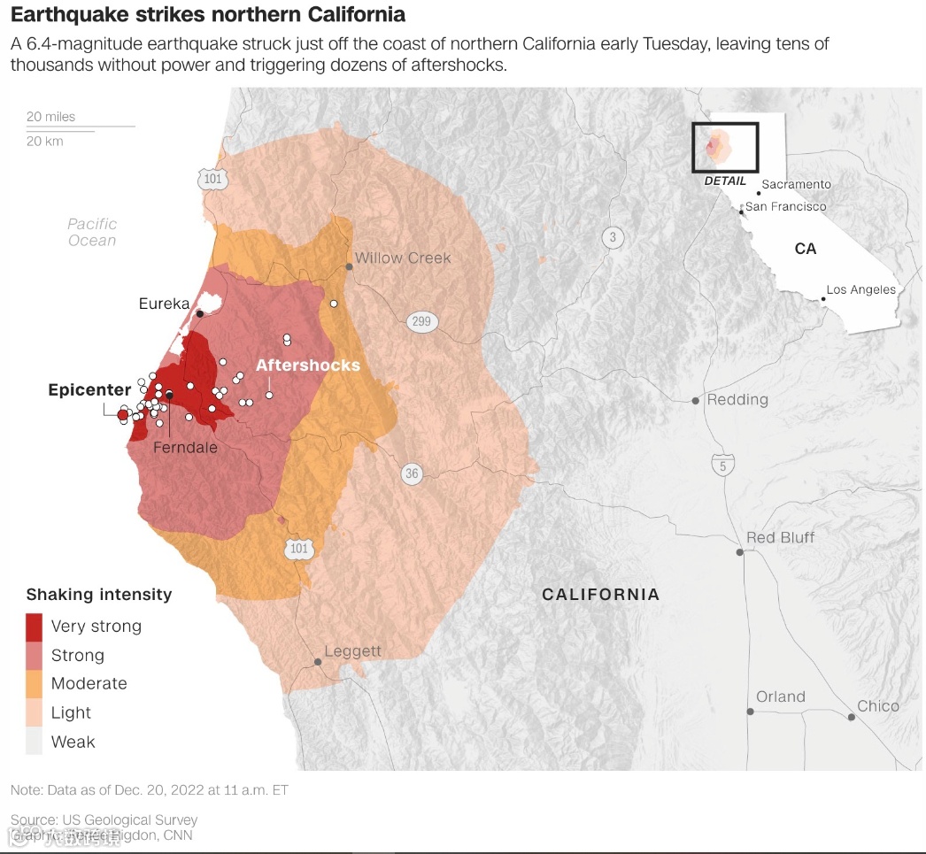 地震发生在太平洋标准时间凌晨2点30分,随后发生了大约80次余震,震中位于旧金山洪堡县近海以北215英里(350公里)处,该县主要是农村地区,以红木林、当地海鲜、木材而闻名工业和奶牛场。