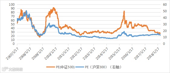 上周市场估值水平维持稳定,沪深300PE值微升至13.42,中证500PE略升至26.46。中证500估值水平已经处于历史较低水平。中证500与沪深300PE比处在近10年来低位。