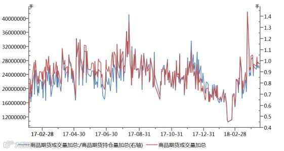 从全市场成交及持仓情况来看,期货市场成交量、持仓量大幅相对稳定,成交持仓比基本不变。
